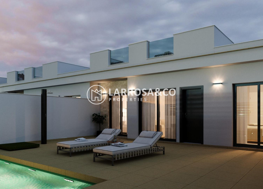 Villas Pareadas y Adosadas de Obra Nueva en Roldán, Murcia Modernas Villas de Una Planta con Solárium y Piscina Privada Descubra este exclusivo complejo de villas pareadas y adosadas de una sola planta en Roldán (Murcia), diseñado para ofrecer comodidad, estilo y eficiencia energética. Con opciones de 2 o 3 dormitorios y 2 baños, cada vivienda cuenta con solárium privado, piscina y aparcamiento en la parcela, ideal para disfrutar del clima mediterráneo durante todo el año. Ubicado en un complejo cerrado con control de seguridad, este residencial garantiza privacidad y tranquilidad, a la vez que se encuentra cerca de todos los servicios esenciales, parques, instalaciones deportivas y prestigiosos campos de golf. Características de Alta Calidad y Diseño Funcional Cada villa ha sido construida con materiales de primera calidad para ofrecer un hogar moderno y confortable: Carpintería exterior en PVC con rotura de puente térmico y doble acristalamiento. Cocina totalmente equipada con muebles de gran capacidad y electrodomésticos incluidos. Baños elegantes con muebles suspendidos, espejo con iluminación LED y mamparas en las duchas. Puerta de entrada de seguridad para mayor tranquilidad. Preinstalación de aire acondicionado por conductos. 3 paneles solares fotovoltaicos (1,5 kW) para mayor eficiencia energética. Cocina de verano en el solárium con fregadero y enchufe para frigorífico. Ubicación Estratégica en Roldán, Murcia Roldán es un encantador pueblo tradicional con una ubicación privilegiada en la Región de Murcia. Dispone de todos los servicios esenciales, como supermercados, restaurantes, bares, clínicas de salud, farmacias, gasolineras y más. Además, esta promoción se encuentra a pocos minutos de algunos de los mejores campos de golf de la zona, como La Torre Golf y Terrazas Golf, ofreciendo una experiencia única para los amantes de este deporte. Distancias a puntos de interés clave: Aeropuerto de Murcia-Corvera – 15 km (15 minutos en coche). Playas del Mar Menor – 15 km (20 minutos en coche). Campos de golf La Torre y Terrazas – Menos de 5 km. Centro de Murcia – 30 km (30 minutos en coche). Un Hogar Perfecto en el Mediterráneo Ya sea como residencia habitual, casa de vacaciones o inversión inmobiliaria, estas villas en Roldán ofrecen la combinación perfecta de diseño moderno, ubicación privilegiada y calidad de vida. Contáctenos hoy mismo para más información o para concertar una visita a su futura vivienda en Roldán.