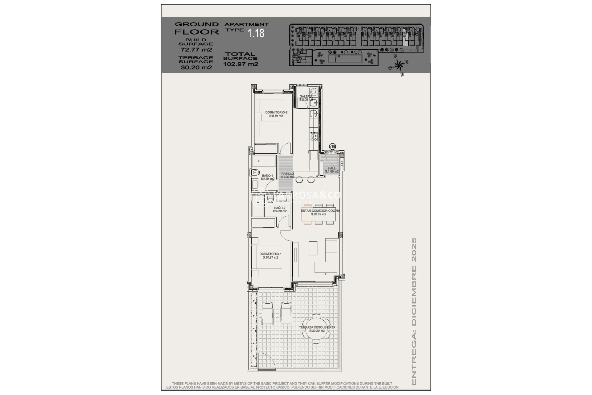 Nieuwbouwproject in Torrevieja, op slechts 1 km van de zee Moderne appartementen met 2 en 3 slaapkamers Gelegen in het bruisende Altos del Sol gebied van Torrevieja, deze nieuwe residentiële ontwikkeling biedt een verscheidenheid aan appartementen met 2 en 3 slaapkamers. De appartementen op de begane grond hebben een eigen tuin, terwijl de appartementen op de bovenste verdieping een eigen solarium hebben voor exclusieve ontspanning in de buitenlucht. Daarnaast bevat het complex een stadswoning, voor wie op zoek is naar extra ruimte en privacy. Elke woning heeft een ondergrondse parkeerplaats en opslagruimtes zijn optioneel beschikbaar. Ruime gemeenschappelijke ruimten en gezinsvriendelijke voorzieningen Het wooncomplex is zorgvuldig ontworpen met ruime gemeenschappelijke ruimtes, met aangelegde tuinen die een rustige omgeving creëren. Gezinnen kunnen genieten van een groot gemeenschappelijk zwembad met een speciaal gedeelte voor kinderen, perfect om te ontspannen en gezellig samen te zijn onder de warme mediterrane zon. Het project ligt op ongeveer 1 km van Playa de Los Locos, waardoor bewoners gemakkelijk toegang hebben tot het strand. Hoogwaardige afwerking en energiezuinige kenmerken Deze woningen onderscheiden zich door hun hoogwaardige afwerking en aandacht voor detail. Elke woning is uitgerust met een 600 W fotovoltaïsch zonnepanelensysteem, een milieuvriendelijke energieoplossing. Extra eersteklas voorzieningen zijn onder andere ingebouwde barbecues op de solariums, gepantserde voordeuren, ingebouwde kasten met binneninrichting, badkamermeubels met doucheschermen en vloerverwarming in de badkamers, waardoor comfort en stijl in elke hoek verzekerd zijn. Ideale locatie in de buurt van diensten en attracties Dit project ligt dicht bij alle essentiële voorzieningen, waardoor het een gunstige locatie is voor zowel permanente bewoners als vakantiegangers. Altos del Sol staat bekend om de goede verbindingen met plaatselijke winkels, eetgelegenheden en uitgaansgelegenheden op loopafstand. De luchthaven Alicante-Elche ligt op 45 minuten rijden (43 km), terwijl het winkelcentrum Habaneras op slechts 3 km ligt en een uitgebreide winkelervaring biedt. Ervaar Torrevieja's mediterrane levensstijl Torrevieja, gelegen in het zuiden van Alicante, biedt een typische mediterrane ervaring. Met meer dan 300 dagen zon per jaar en een gemiddelde jaartemperatuur van 20ºC, kunnen bewoners het hele jaar door genieten van prachtig weer. De stad is beroemd om zijn rijke gastronomie, met verse ingrediënten uit zowel de zee en de lokale boerderijen. Bovendien, Torrevieja beschikt over prachtige stranden, promenades, musea, en tal van activiteiten geschikt voor gezinnen met kinderen, zorgen voor een levensstijl vol met vrije tijd en ontspanning. Ontdek Torrevieja Of u nu op zoek bent naar een levendige kustgemeenschap of een rustige retraite, deze ontwikkeling biedt een unieke kans om het beste van de kust van Torrevieja charme te genieten. Ervaar alles wat deze prachtige stad te bieden heeft, van het warme klimaat tot het rijke culturele en culinaire erfgoed.