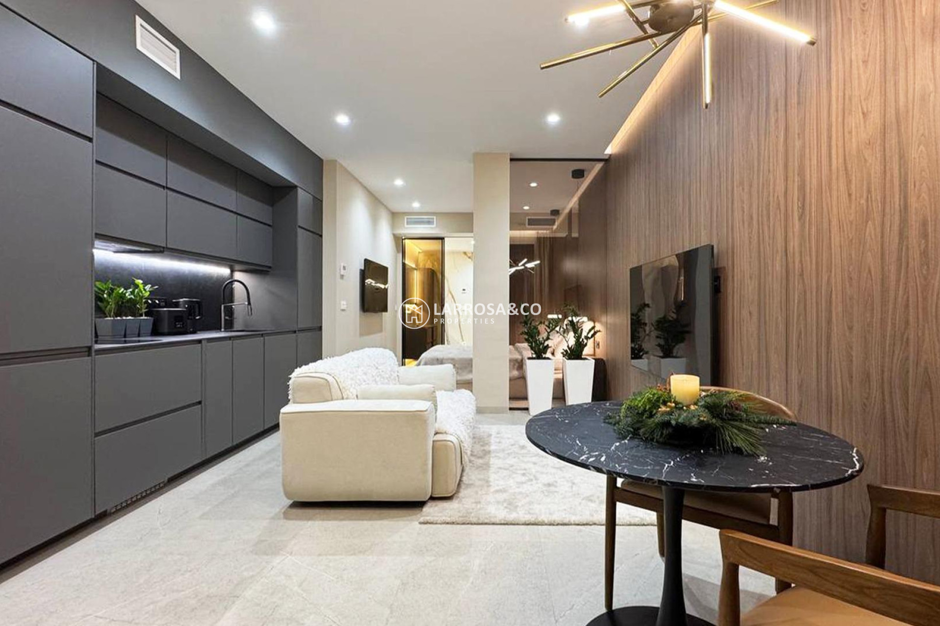 Stijlvol 1-slaapkamerappartement van 45 m² in het hart van Torrevieja, op slechts 250 meter van Los Locos-strand. Het appartement biedt een lichte woonkamer met panoramische vloer-tot-plafondramen, een volledig uitgeruste moderne keuken en een comfortabele slaapkamer met ingebouwde kast en elegante afwerking. De badkamer beschikt over een regendouche, stenen wastafel en vloerverwarming. Klimaatregeling, LED-verlichting en een privéterras maken dit verfijnde mediterrane toevluchtsoord compleet – ideaal als vakantiewoning of permanente woning onder de Spaanse zon.