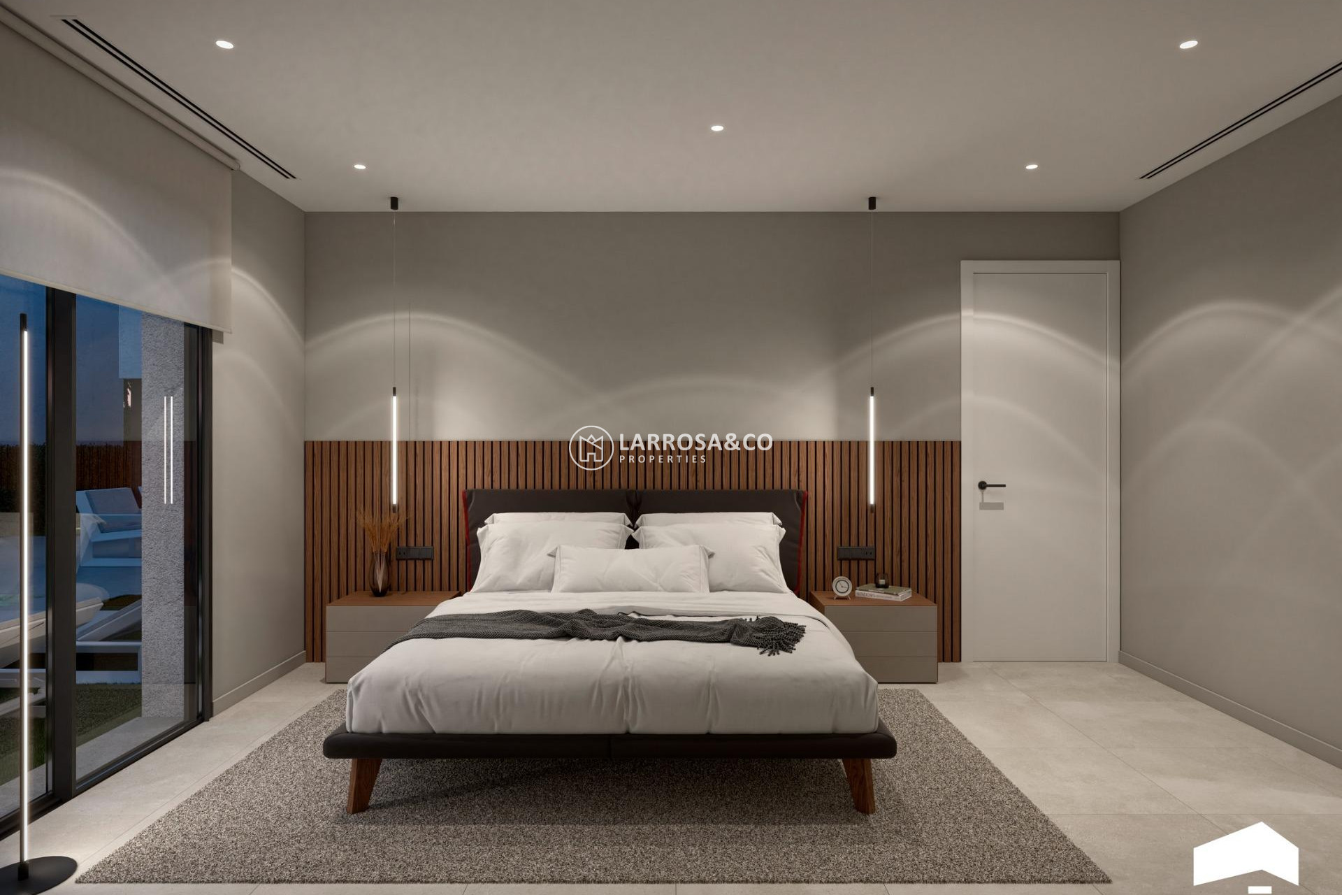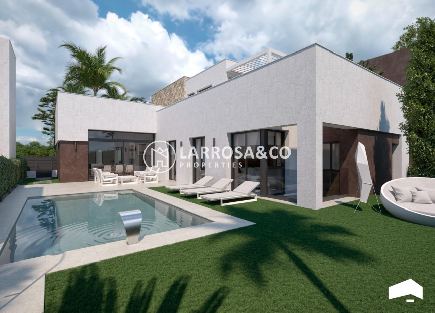 NEW BUILD VILLAS IN PRIVATE GATED RESORT IN PROVINCE OF MURCIA New Build villas in private gated resort in the Murcia region, surrounded by excellent golf courses and just 10 minutes from the sandy beaches of the Mar Menor Sea. Villas build over of 2 floors and has 3 bedrooms, 2 bathrooms and a guest toilet and are designed with a contemporary style and open concept, consisting of a fully equipped kitchen and living-dining room, fitted wardrobes, private garden with the pool and off road parking space, private solarium. Large villa of 146m² plus a very useful 120m² basement finished with smooth walls, water and electrical points. This offers the perfect opportunity to use as additional accommodation, office, gym, cinema room, children's playroom.... Located in a private gated resort, with a main access entrance and 24 hours security. The resort is designed around an impressive 126.000 m2 green area. It comprises walking and cycling paths, sport facilities, paddle and tennis courts, a mini-golf course, gardens, dog parks, leisure areas, clubhouse…. Also in the central area is the jewel of the resort, a crystal-clear artificial lake of almost 17.000m2 of water surface, surrounded by white sandy beaches and palm trees, bringing a piece of the Caribbean to the Murcia Region. There are 2 islands in the lake, one of them has its own bar, there are also “beach Chiringuitos” spread around the lake. The resort is strategically located less than 4 km from the beach and the town of Los Alcázares, where you can practice various water sports, surrounded by several golf courses and the city of Cartagena less than 15 minutes by car and 22 km from Murcia airport, therefore having a wide cultural, gastronomic and sports offer within reach.