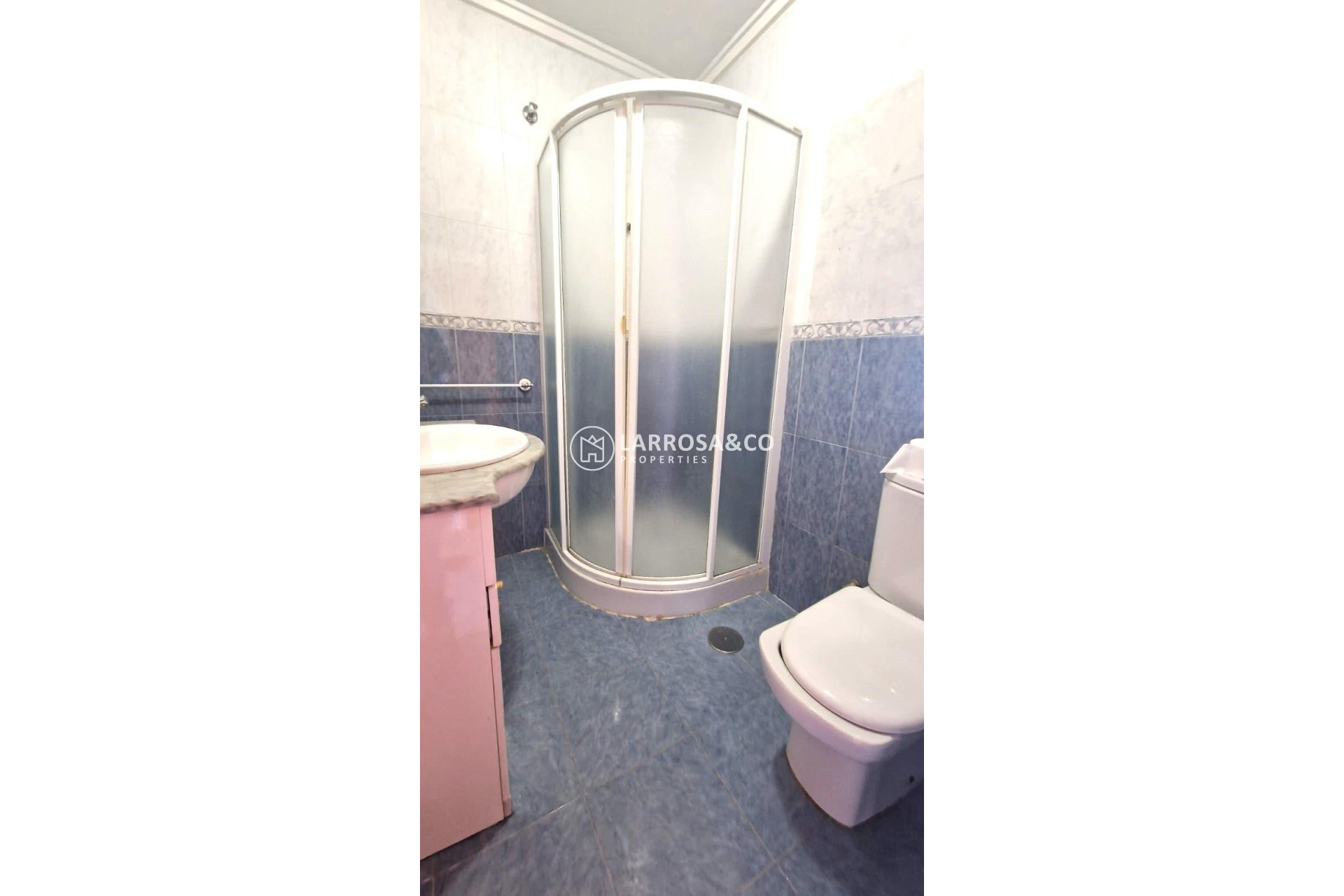 Semi-detached house in a beautiful Residential with swimming pool, about 10 minutes drive to the beach of La Zenia, Ferris beach, Náufragos beach,..., ~The ground floor consists of a large front terrace with a porch, a living room, a semi-equipped independent kitchen, 2 bedrooms with built-in wardrobes and a bathroom (with shower tray).~The upper floor consists of a bedroom with built-in wardrobes and a large solarium with clear views. ~At the back of the house, there is another terrace with a storage room and a garden shed. ~NO furnished. Air conditioning. Fans.~You can park the vehicle in the community street.~Very well located, near all amenities, supermarkets, bus stop, ..., approximately 5 minutes drive to Punta Prima and 10 minutes drive to the Zenia Boulevard shopping center. ~~