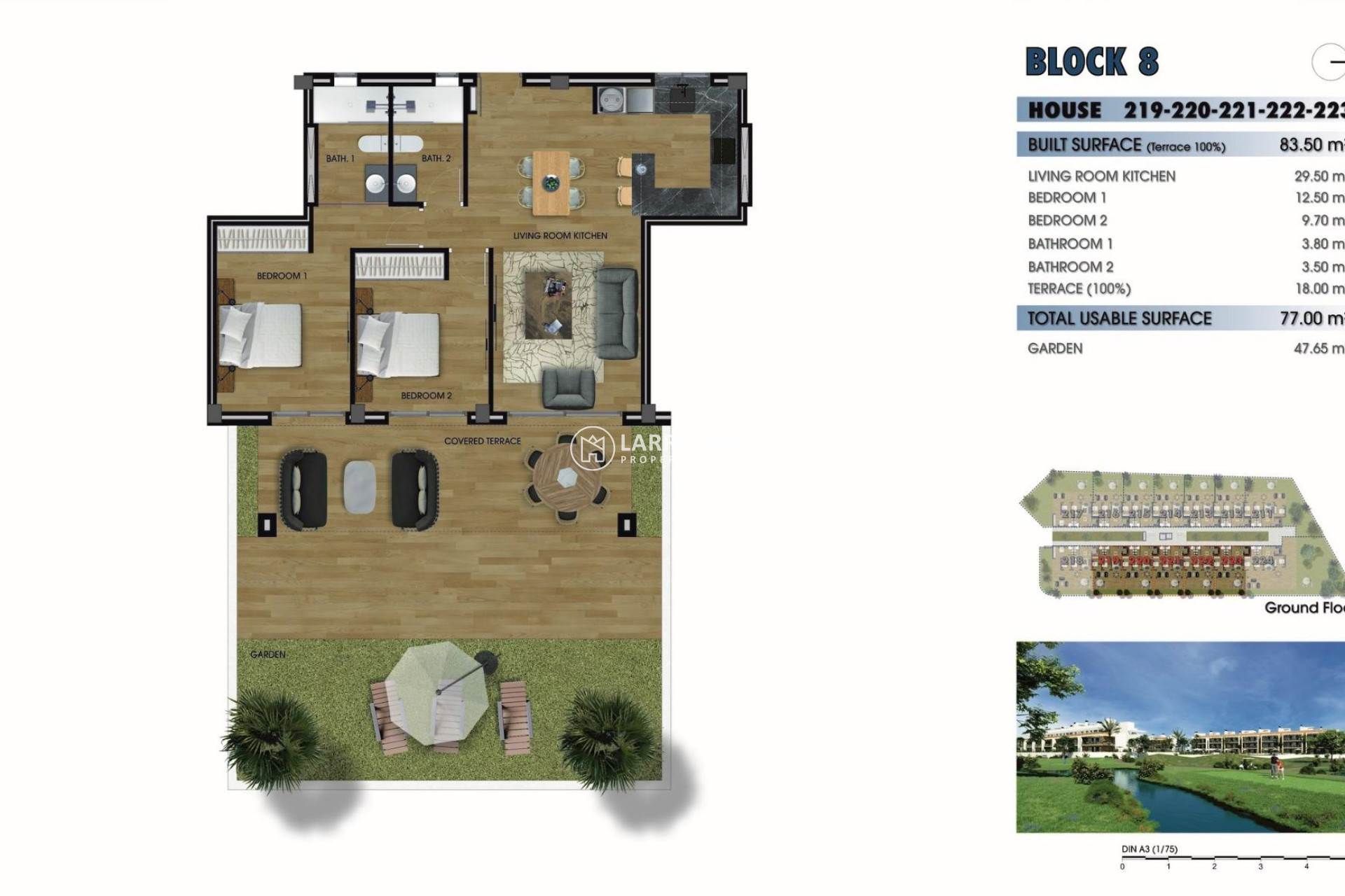 NEW BUILD RESIDENTIAL COMPLEX NEAR LA SERENA GOLF, LOS ALCAZARES This amazing complex will be formed by 244 apartments with 2 and 3 bedrooms, divided in 8 blocks and 20 private Villas. Modern apartments in 3 floors (ground floor plus 2), ground floor with nice gardens, and some of them with private swimming pool and second floor with nice terraces and private solariums. Corner apartments (4 per floor) and top floor apartments has 3 bedrooms and the rest 2 bedrooms. East facing properties looking to the communal areas and West facing with wonderfull golf course views. Complex with the communal pool and the communal areas. Every apartment have their own parking space and private storage on the basement, included on the price. Residential located in a frontline of the prestigious golf course “La Serena Golf”. This golf course is well renowned for its lakes and vegetation that interweave with the golf course. The water and lakes are present in 16 of the 18 holes, but all the course is designed to offer the golfer different strategies in each hole. Another aspect that makes this golf course unique is that it’s connected by walking to the city centre, something impossible to find in other golf locations that allow us to enjoy the calm and the beauty of the area without refusing the access to the services that Los Alcázares offers. Los Alcázares an exceptional area on the Costa Cálida at only 25 minutes from Murcia airport and 55 min from Alicante airport. The area is connected through highway with the cities of Cartagena, Murcia and Alicante and the rest of the beaches of the Costa Cálida and the Costa Blanca.