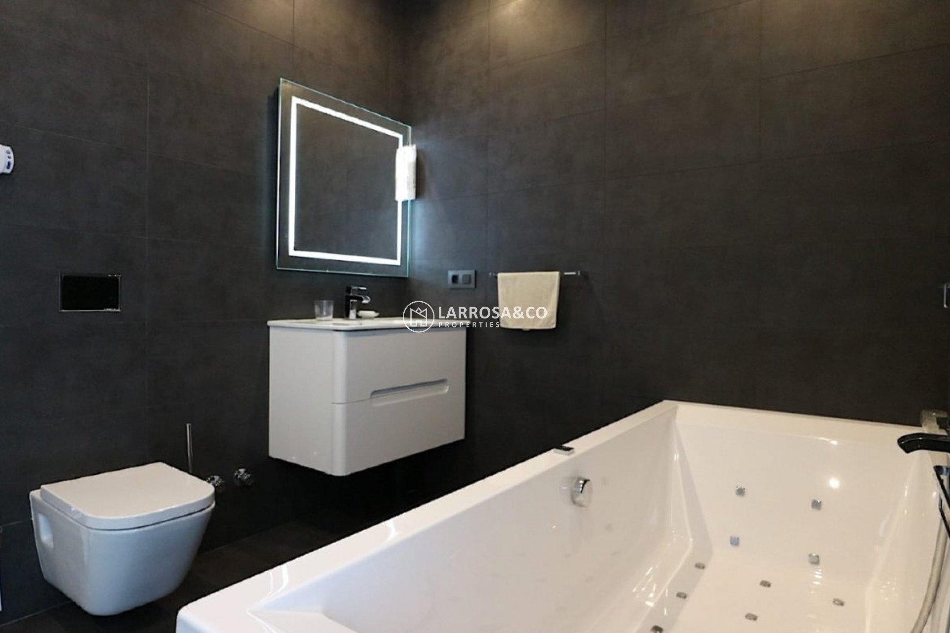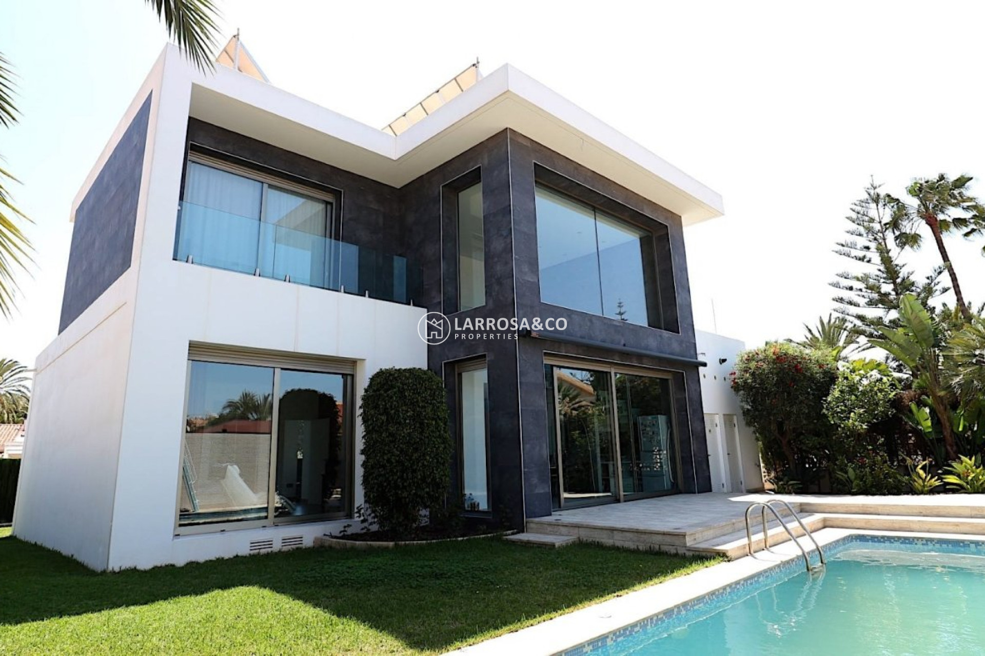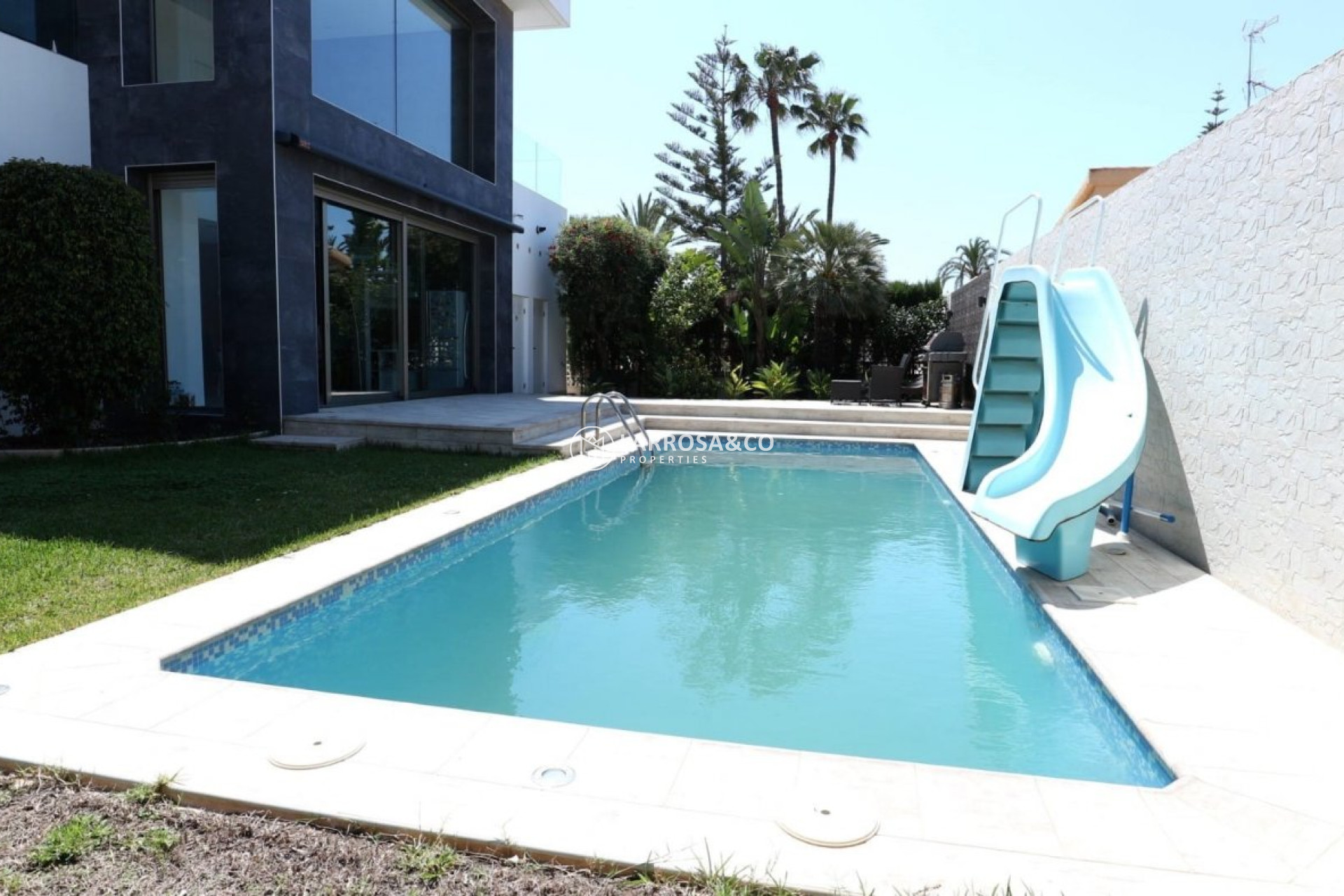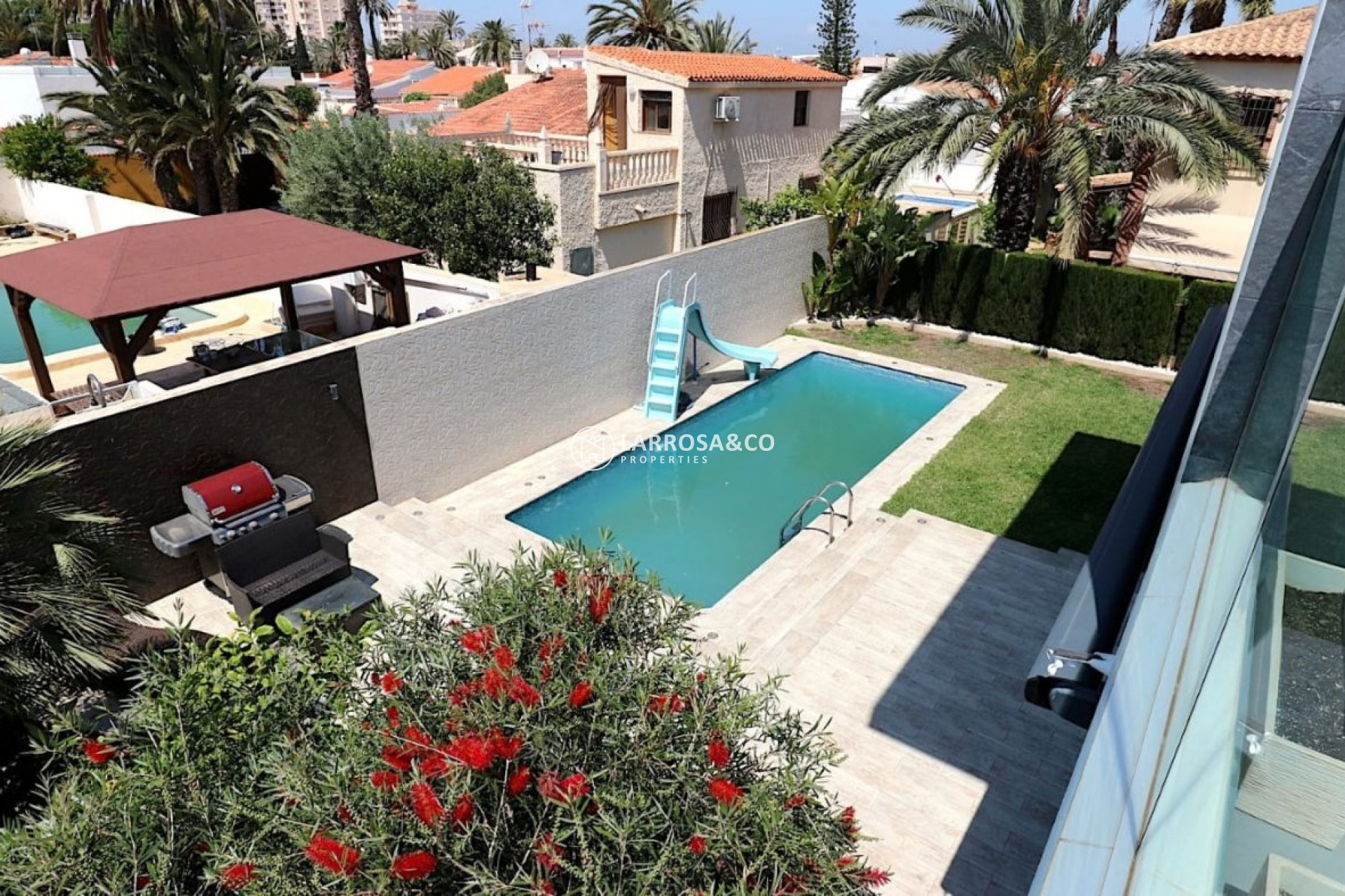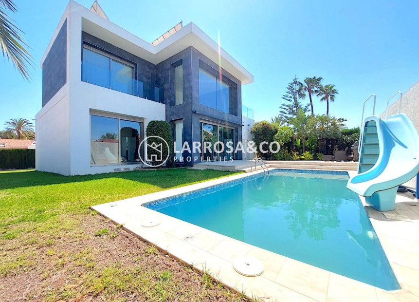 Luxury villa of 250 square meters built and with a plot of 600 square meters with a saltwater pool.~ The property consists of two floors, on the first floor you will find a large living / dining room with kitchen. A bedroom with en-suite bathroom and a toilet.~ Going up The double-glazed designer staircase leads to the second floor where there are two large bedrooms and a full bathroom with Jacuzzi to share located between the two bedrooms with access to it. It also has access to the large terrace that borders the house on two sides from which you have sea views.~ It has a barbecue area, garage for two vehicles, central heating with underfloor heating throughout the house, 6 solar panels, air conditioning, balcony overlooking the pool.~ The property It is located in one of the areas closest to the center and exit for Alicante - Murcia and quiet to live all year round. The nearest beach is Los Locos and is about a 10-minute walk away. You have nearby supermarkets, bars, / restaurants, beaches, health center and the center of Torrevieja is only 15/20 minutes walking.~ In the same urbanization ( Los Angeles ) there is a place where you will find a restaurant , a bar ( where they do karaoke , music etc ) They also have a swimming pool , sauna , paddle tennis courts , soccer and a gym~