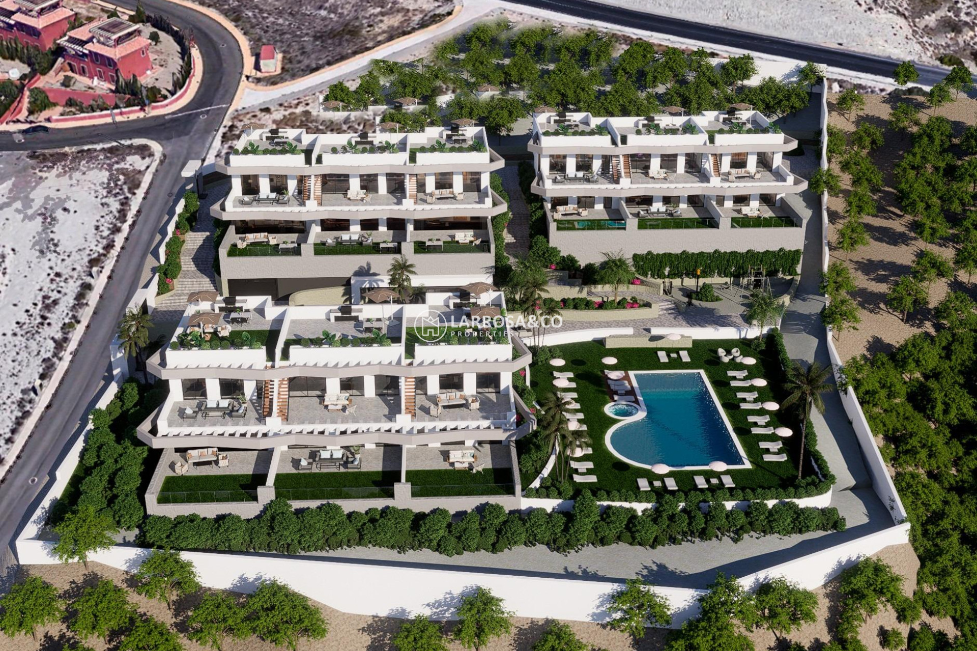 NEW BUILD RESIDENTIAL COMPLEX IN FINESTRAT New Build unique and exclusive high standing residential complex in Balcon de Finestrat. This complex of modern bungalows with 2 and 3 bedrooms, all with 2 bathrooms, open plan kitchen with the living and dining room. Top floor bungalows with private solarium and ground floor bungalows with private garden and possibility of private pool at an extra cost. Properties has loads of natural light and designer island in the kitchen. Lift in all homes. Sustainable construction with energy certificate A. Each property has private parking. Indoor Fitness Gym. Bio-healthy area for sports. Communal swimming pool. Indoor and outdoor LED lighting pack. High quality materials and brands. The properties have access to a large swimming pool and enjoy one of the best locations on the Costa Blanca. It is a great opportunity and privilege to be able to live with this environment of golf and beach, close to all amenities of all services considered one of the best places to invest. Finestrat located in the Marina Baixa region of the Costa Blanca. Benidorm is just a five-minute drive from the properties and offers all the services you would need including shops, bars, restaurants, supermarkets, banks, pharmacies and several private international schools. Close to the beaches of Levante, Poniente and Cala de Finestrat, with more than 6km in length that are among the best in Europe awarded by the European Union with Blue Flags. All leisure services such as the theme parks of Aqua Natura, Terra Mítica, Terra Natura, Aqualandia and Mundomar, Sierra Cortina and Villaitana Golf courses, hiking and climbing in Puig Campana an incomparable natural setting or enjoy of nautical sports. Distance to the sea 4 km, to the airport 26 km and to the golf 1km. Complex located 40 minutes from Alicante airport.