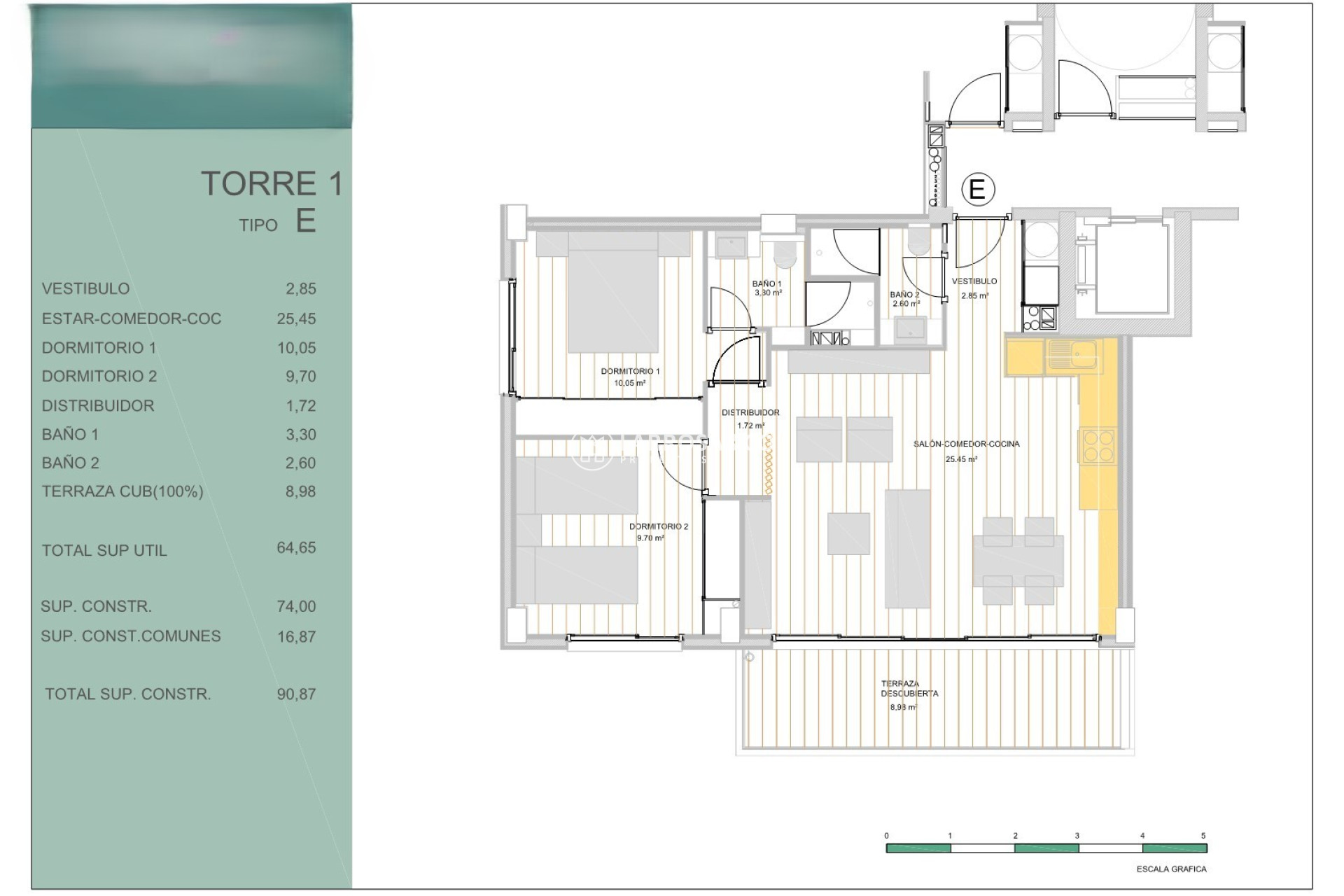 The development offers 2-bedroom, 2-bathroom apartments with a constructed area of 63 m², 55 m² of usable space and 8.9 m² of terraces. The layout includes an open-plan kitchen connected to the living area, creating a bright and practical space. All apartments include kitchen furniture, electric kitchen appliances, fully equipped modern bathrooms, built-in wardrobes in the bedrooms, full installation of ducted air conditioning, high-quality porcelain stoneware flooring and smooth white wall paint.