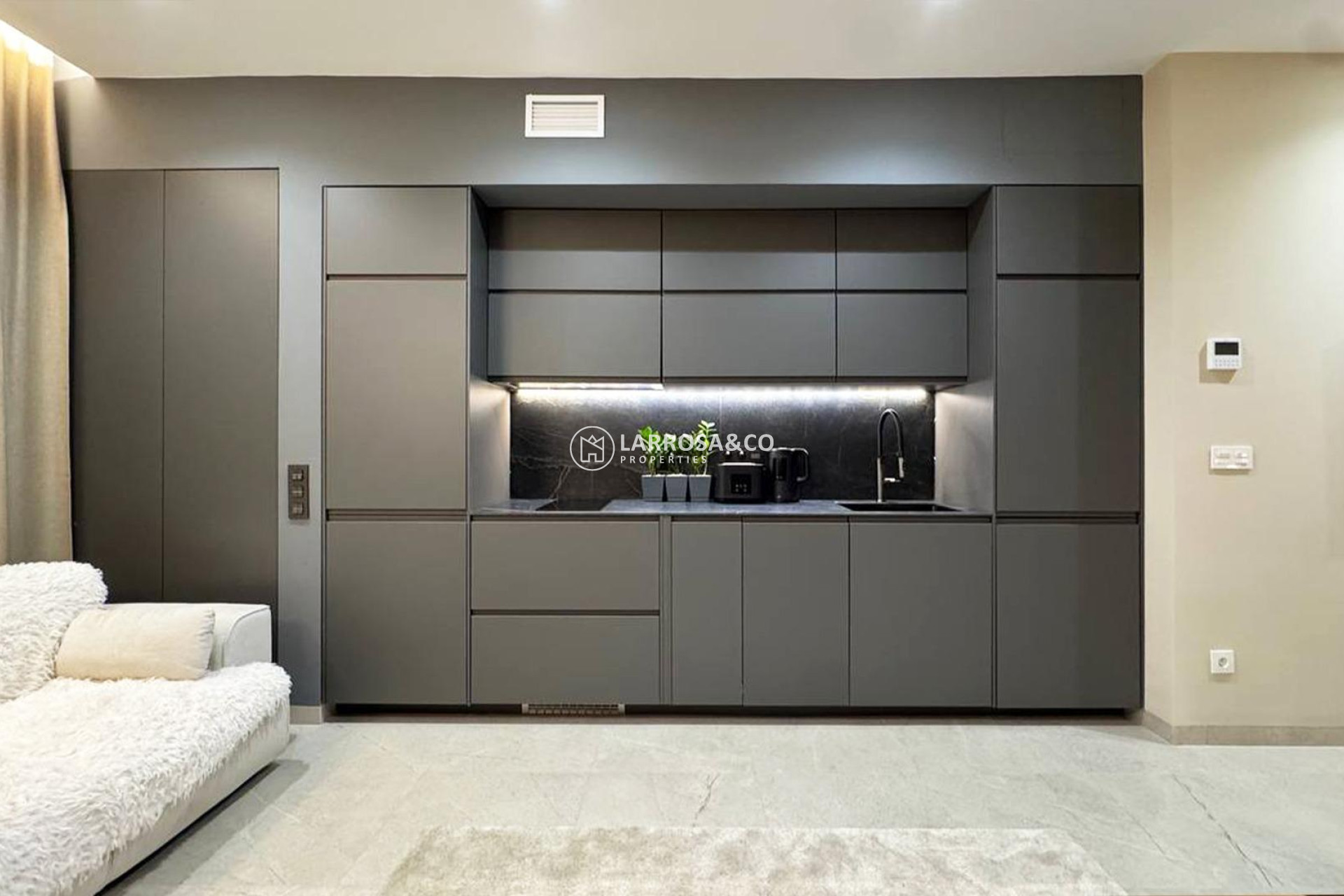Stylish 1-bedroom apartment of 45 m² in the heart of Torrevieja, just 250 meters from Los Locos Beach. The apartment offers a bright living area with panoramic floor-to-ceiling windows, a fully equipped modern kitchen, and a comfortable bedroom with built-in wardrobe and elegant finishes. The bathroom features a rainfall shower, stone washbasin, and underfloor heating. Climate control, LED lighting, and a private terrace complete this sophisticated Mediterranean retreat—ideal as a holiday home or a permanent residence under the Spanish sun.