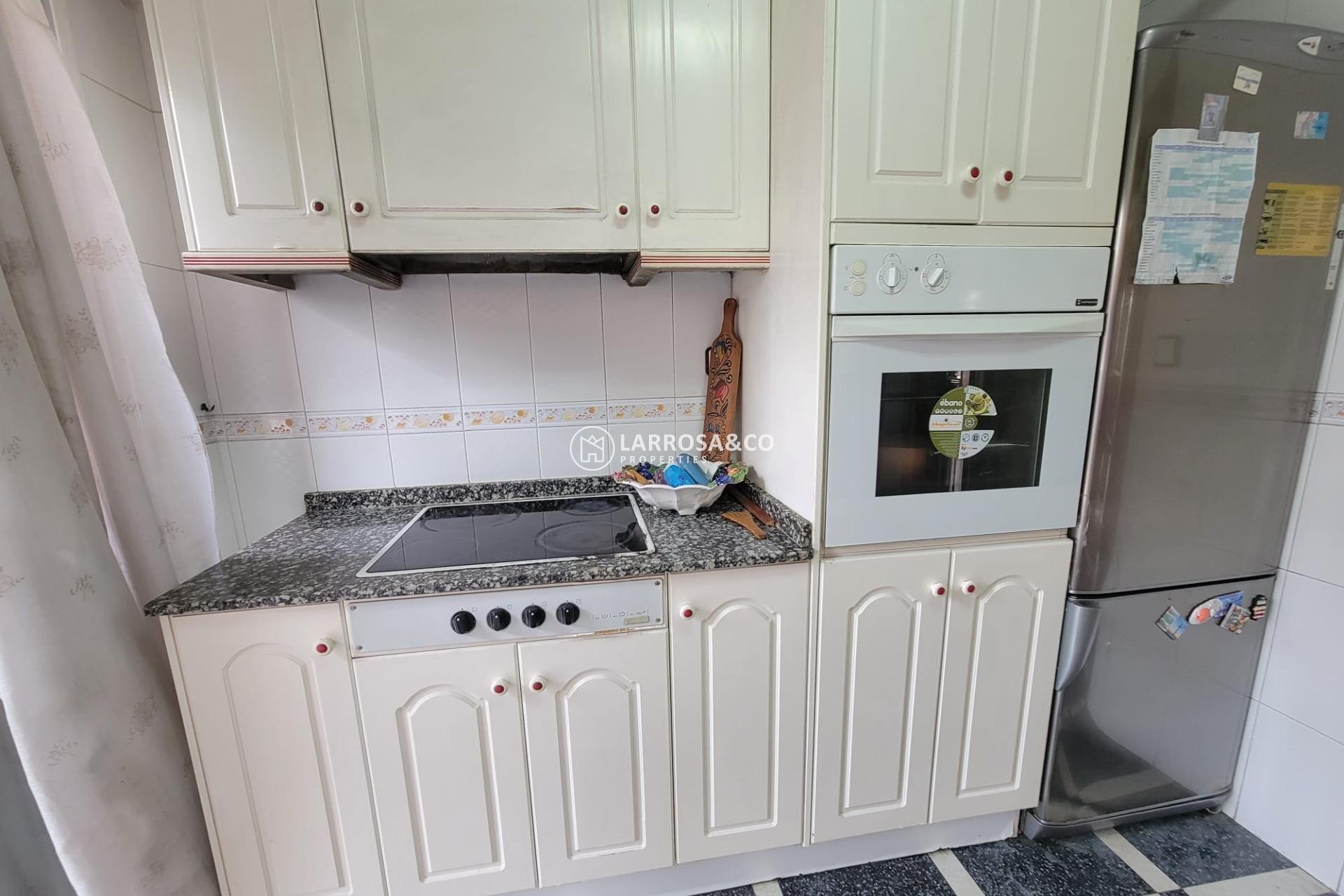 Spacious apartment located in the city center, about 200 m from the Promenade and the Natural Pools. It consists of an entrance hall, a spacious living room with large windows and a terrace, a fully equipped separate kitchen with a pantry room (with a sink, washing machine,...), two double bedrooms, a simple bedroom and two bahtrooms (one with a shower, the other with a bathtub). Furnished. Wardrobes in the bedrooms. South and West facing. Elevator in the builing. Perfect location, close to all amenities, restaurants, cafes, shops, supermarkets, bus stops, the new leisure area of the Port of Torrevieja and about a 10-minute walk to the beach Playa del Cura.