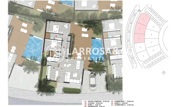 Новые виллы в Рольдане – современная жизнь в средиземноморском стиле Эксклюзивные виллы новой постройки в средиземноморском курорте Эль-Альба Откройте для себя эту ограниченную коллекцию из 3 новых независимых вилл в Рольдане, расположенных в престижном средиземноморском курорте Эль-Альба. Каждая вилла спроектирована на одном этаже для максимального комфорта и функциональности, предлагает на выбор 2 или 3 спальни и включает 2 ванные комнаты, частный бассейн и солярий на крыше. Эти современные дома сочетают в себе элегантный интерьер и экстерьер в средиземноморском стиле с использованием натурального камня и деревянных элементов. Результат – идеальное сочетание стиля, качества и удобства в спокойной, но хорошо связанной с инфраструктурой местности. Просторные, светлые и функциональные интерьеры Каждая вилла имеет: Открытую гостиную и столовую с современной кухней в американском стиле Встроенные шкафы во всех спальнях Частный сад с бассейном Солярий на крыше, идеально подходящий для принятия солнечных ванн и отдыха на свежем воздухе Два частных парковочных места Предварительная установка канального кондиционера Кухни, оборудованные высокими и низкими шкафами Одноуровневая планировка обеспечивает легкий доступ и практичную планировку всего дома, что делает эти виллы идеальными как для постоянного проживания, так и для отдыха. Непревзойденное расположение в Рольдане, Мурсия El Alba Mediterranean Resort - это закрытый жилой комплекс, предлагающий широкий спектр удобств, в том числе: Социальный клуб с баром и лаунджем Общий бассейн Корты для паддл-тенниса Ландшафтные зоны и пешеходные улицы Расположенный всего в нескольких минутах ходьбы от центра Рольдана, жители имеют доступ к супермаркетам, банкам, ресторанам и кафе. Тихий городок Рольдан предоставляет все необходимые услуги, сохраняя при этом непринужденную деревенскую атмосферу. Достопримечательности поблизости Пляжи Мар Менор: 15 км Поле для гольфа Terrazas de la Torre: 4 км Гольф-курорт La Torre: 6 км Торговый центр Dos Mares: 25 км Международный аэропорт Мурсия (RMU): 20 км Центр города Картахена: 35 км Центр города Мурсия: 36 км Этот регион Мурсии славится мягким климатом, природной красотой и высоким качеством жизни. Благодаря отличному дорожному сообщению, вы можете добраться до близлежащих городов, пляжей и полей для гольфа за считанные минуты. Дом вашей мечты под солнцем ждет вас. Свяжитесь с нами сейчас, чтобы запланировать визит или запросить дополнительную информацию.
